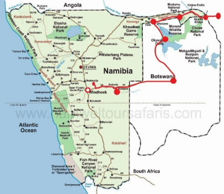 | Départ vers le désert du Kalahari et découverte | DBB | 363 KM |